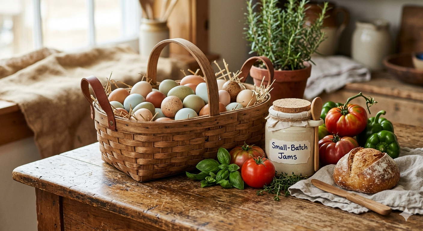 Free-range eggs, seasonal vegetables, small-batch jams, baked goods & more — grown and made right here.