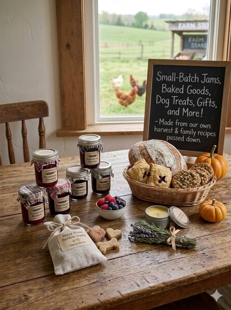 Jams & preserves $7.00/jar · Baked goods - prices vary · Dog treats $6.00 – $10.00 · Unique gifts & local wares -prices vary